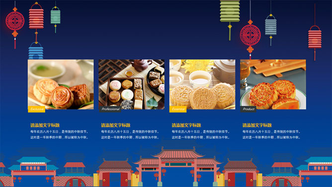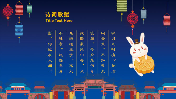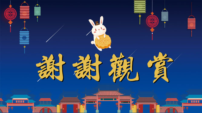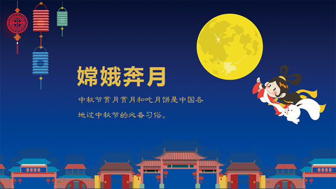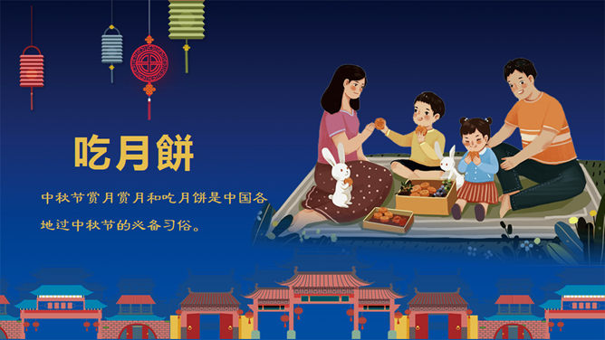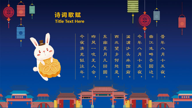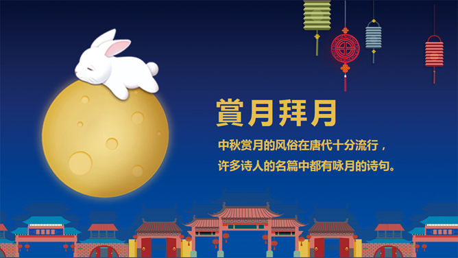 卡通小兔子喜迎中秋PPT模板。一份中秋节主题PPT模板,古典建筑、灯笼、卡通小兔子装饰。