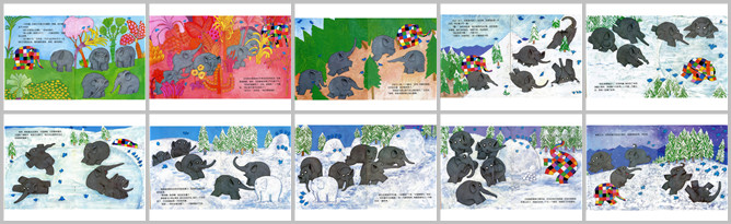 《艾玛打雪仗》绘本故事PPT。一天早晨,花格子大象艾玛遇到一群象,他们看上去不大快活。“他们这是怎么回事?”艾玛问他们。“怎么回事?就是太冷了!”一只象回答说,“就是这么回事。”“这不算太冷。”艾玛说,“只不过比平时冷了一点。他们只要多走走,暖和暖和身体。来吧,跟我来吧。”艾玛带大家朝他们不常去的方向走去
