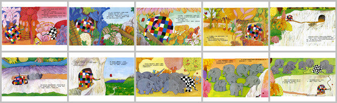 《艾玛和蝴蝶》绘本故事PPT。花格子大象艾玛一路上散步,猛听到:“你好啊,艾玛!”声音是从树上传下来的。“是你吗,猴子?”艾玛答应说。“错了,是我,你的表弟。”表弟韦伯哈哈笑着,从后面矮树丛里走出来。“你好,韦伯,”艾玛也格格笑着说,“你会口技,会用你的声音耍花样,真服了你了。我要去散步。回头见。”