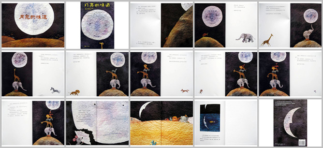 《月亮的味道》绘本故事PPT。动物们在夜里总是想,月亮是什么味道,是甜的吗,真想尝一口,可是怎么也够不到月亮。站到山上也够不到。海龟让大象站到背上。月亮以为这是和她玩游戏呢,就往上跳。大象也够不到,又叫来了长颈鹿。长颈鹿站到大象的背上也是够不着,长颈鹿把斑马叫来了