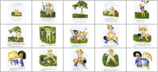《米莉茉莉和花婆婆》绘本故事PPT。花婆婆漂亮的花园里藏着许多秘密。花园的李子树上长满了李子。茉莉和米莉喜欢和花婆婆在一起。他们很爱吃李子。花婆婆总是警告说:吃一把李子有好处,但是吃多了就不好了。花婆婆和茉莉、米莉躺在草地上,她把指顶花套在她们手指上,把奶油花贴在她们的下巴上,把青草分给她们当士兵打仗