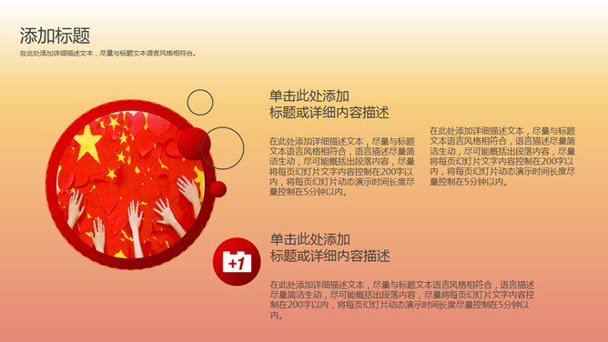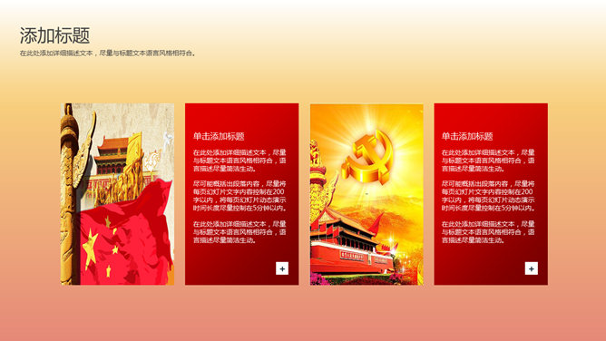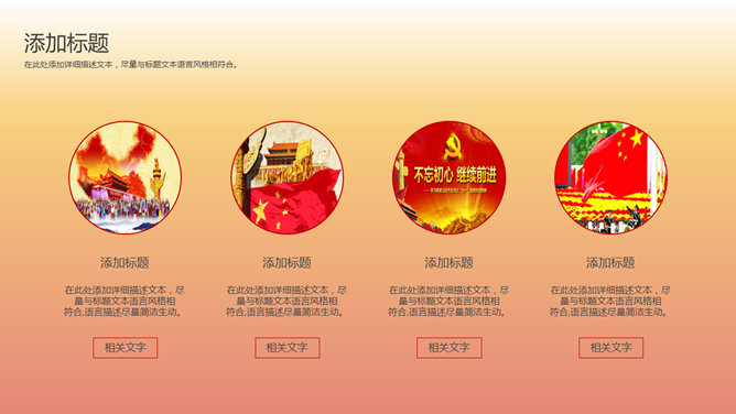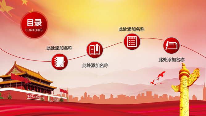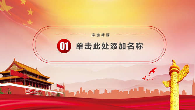 一份简洁的七一建党节幻灯片模板,动态演示效果。关键词:党徽 华表 梦幻泡泡大气红色背景