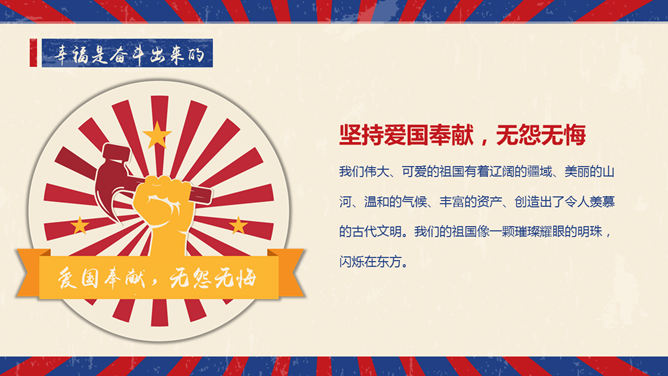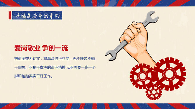 精美复古风五一劳动节PPT模板。一套精美的五一劳动节模板,怀旧复古风格设计。使用字体: