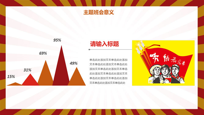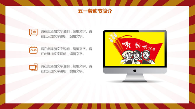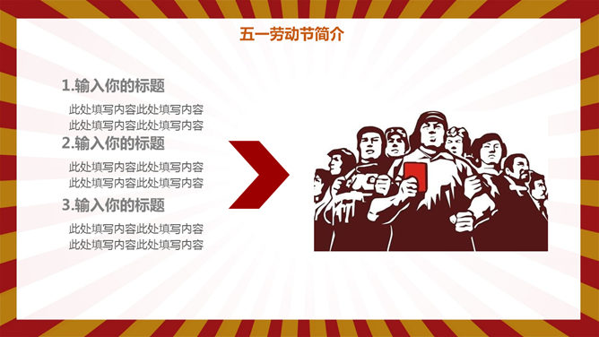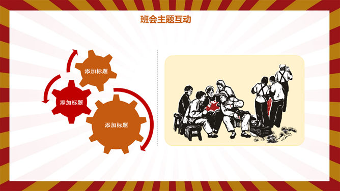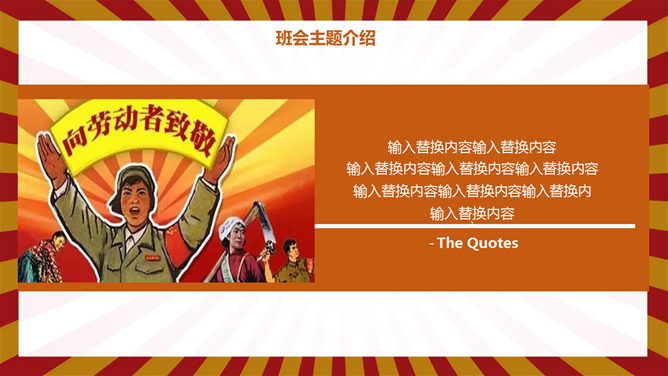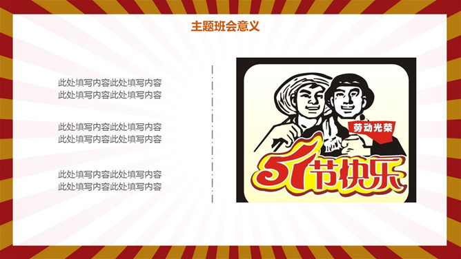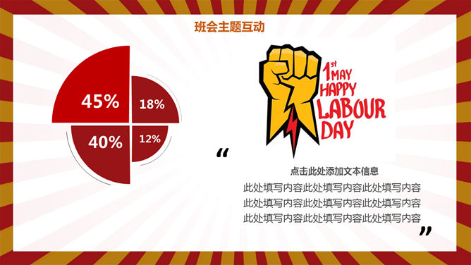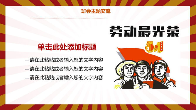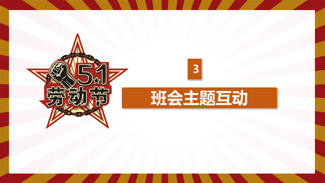 劳动节主题班会PPT课件模板。包括班会主题介绍、五一劳动节简介、班会互动、主题交流、班会意义等。