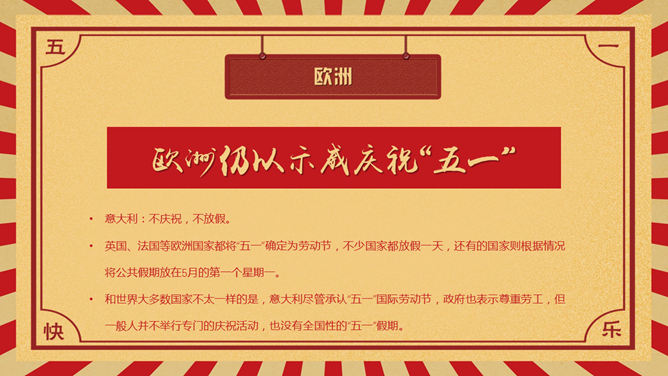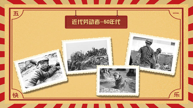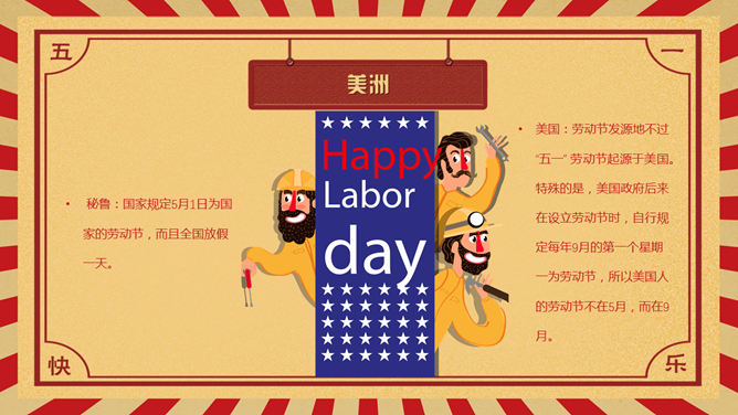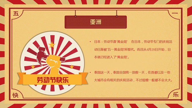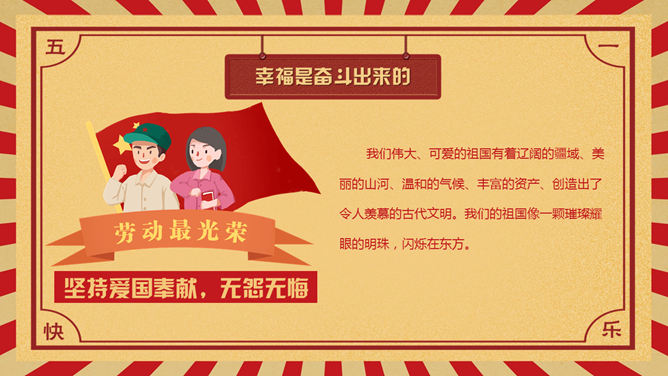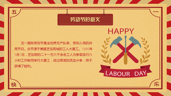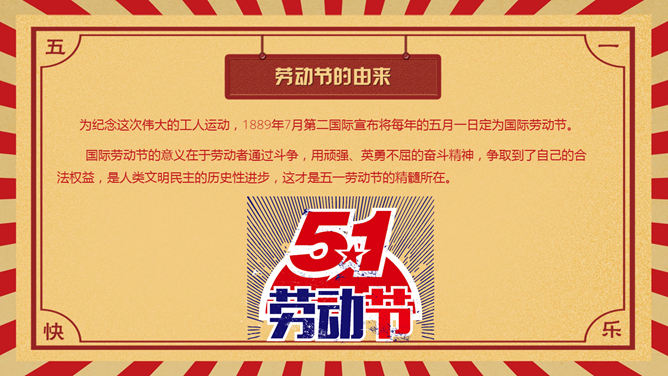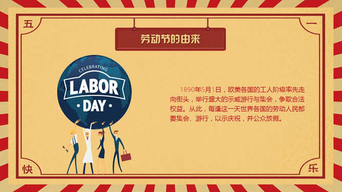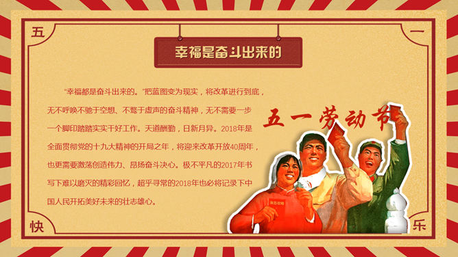 五一国际劳动节介绍PPT模板。包括劳动节介绍、近代劳动者、各地活动、幸福是奋斗出来的几个部分。