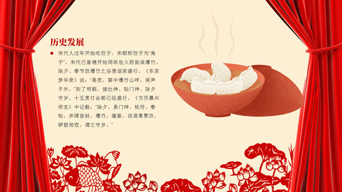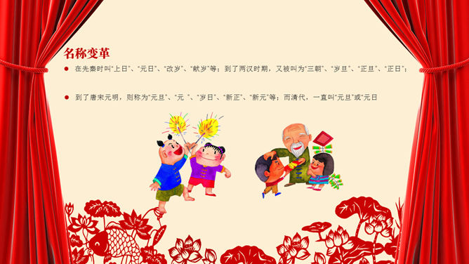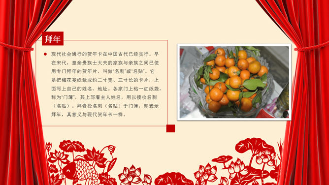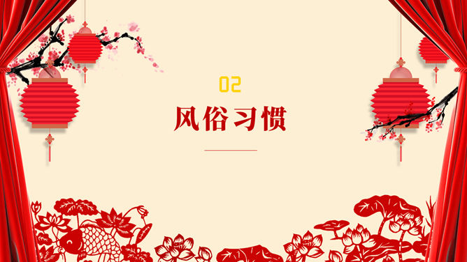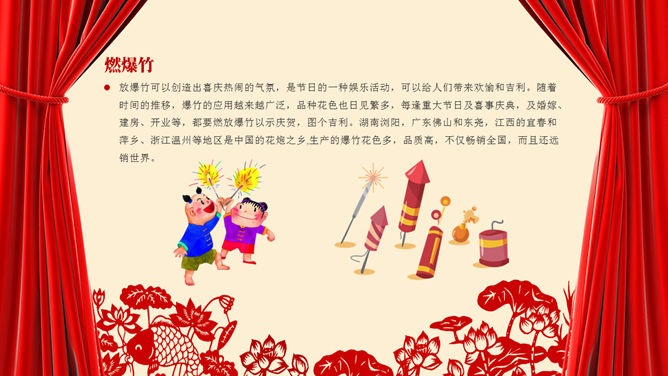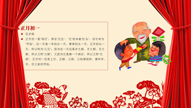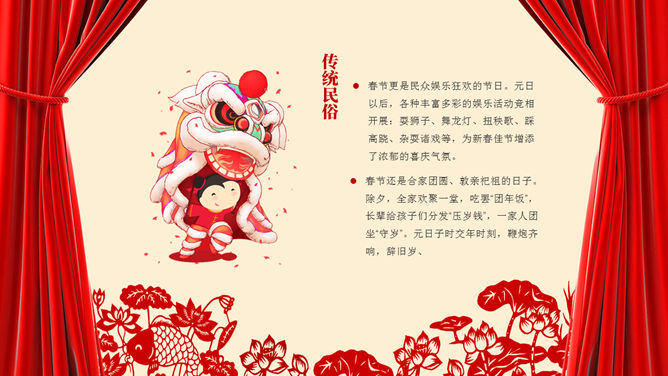 喜庆红色帷幕春节PPT模板。一套春节传统习俗介绍幻灯片模板,喜庆大红色帷幕背景,动态播放效果。