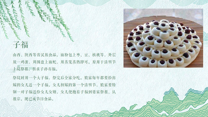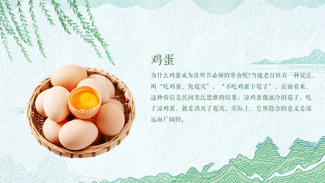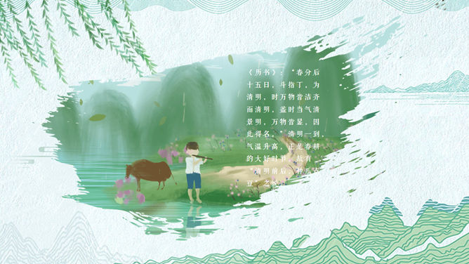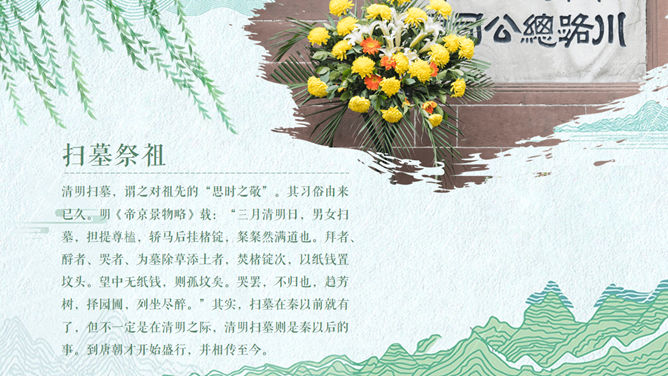 一份介绍清明节习俗的幻灯片,包括清明节简介和习俗介绍:扫墓、踏青、插柳植树、放风筝、荡秋千、蹴鞠、寒食等。
