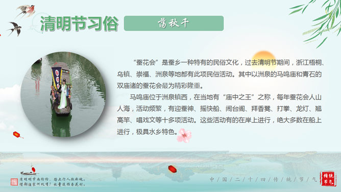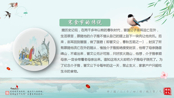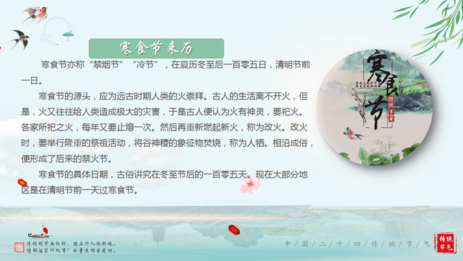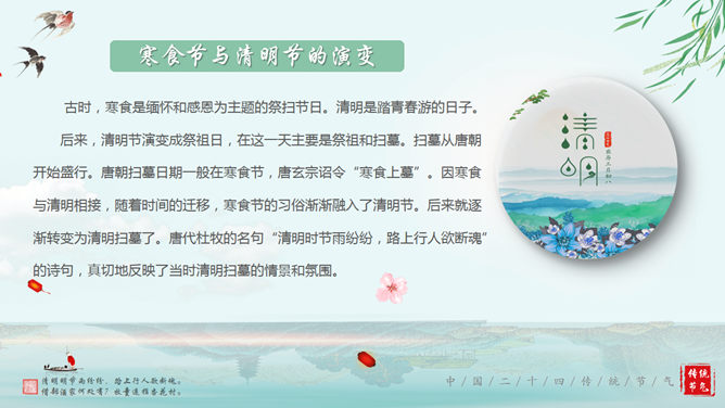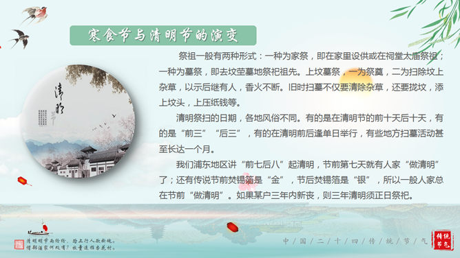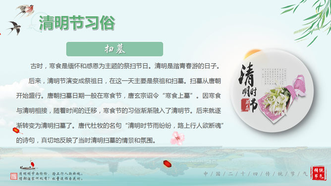 清明节的由来传统习俗介绍PPT。传统节日清明节起源于周朝,距今已有大约2500多年的历史,在古代因为和前一日的寒食节接近,两个节日便逐渐合并。主要习俗是供祭品、烧纸钱,祭奠先人。使用字体:华文行楷、华文新魏、华文彩云。