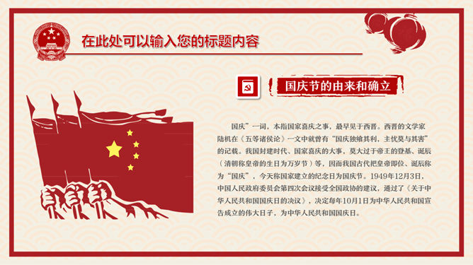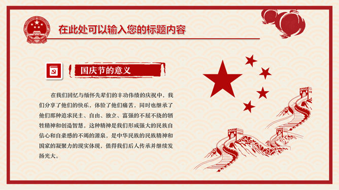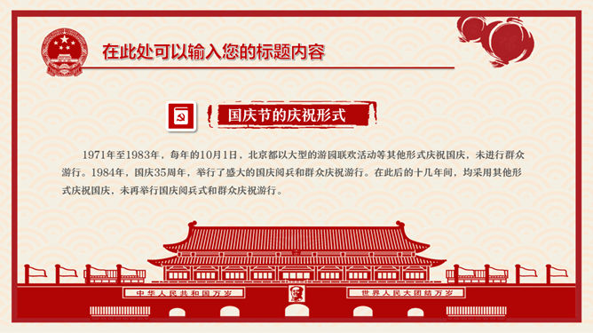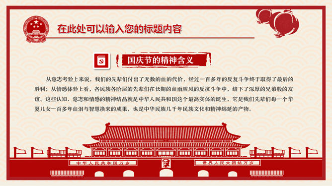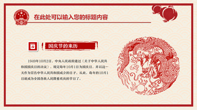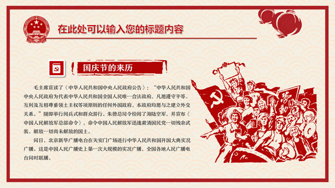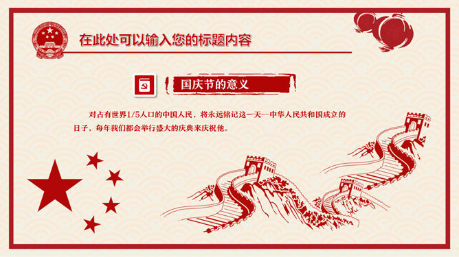 。一套庆祝国庆节主题幻灯片模板,大气喜庆红色主色调,创意剪纸风设计。