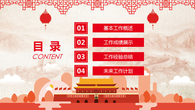 普天同庆国庆节动态PPT模板。一份适合用来制作国庆节相关幻灯片的模板,以天安门、华表、花朵为背景,动态播放。
