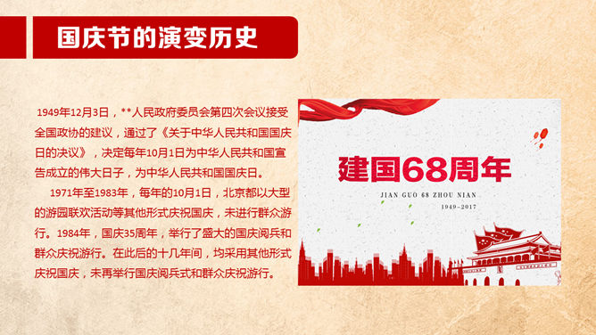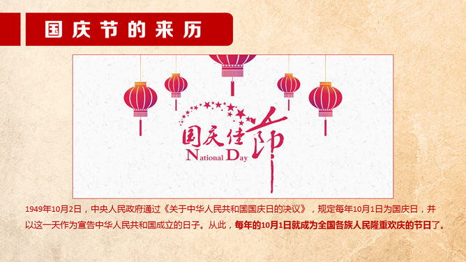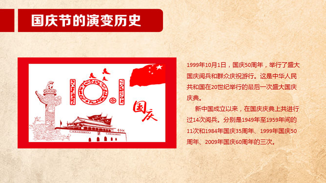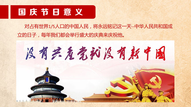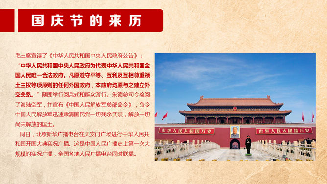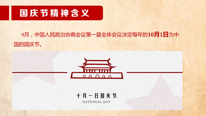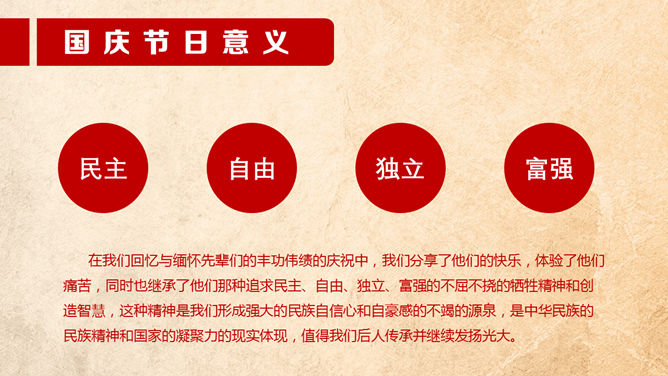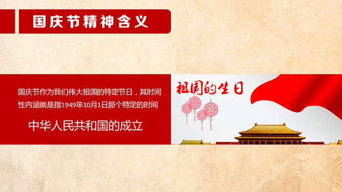 。一份喜庆的国庆节主题幻灯片模板,以国旗、华表、红色飘带为背景,烟花绽放动态效果。