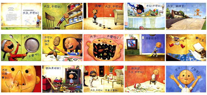 《大卫,不可以》绘本故事PPT。此绘本荣获美国凯迪克大奖!一个淘气的小男孩,一个严厉又有爱的母亲。这个天真无邪的小男孩把家里搞得一团糟,一会站到椅子上从高处拿玩具,一会把身上弄一身泥巴,一会把浴缸变成他的海盗战场,一会光着屁股跑到外面去玩,一会敲打锅碗瓢盆,一会把花盆打碎。妈妈一直说:不可以。最后妈妈说:宝贝,来这里!大卫乖,我爱你!
