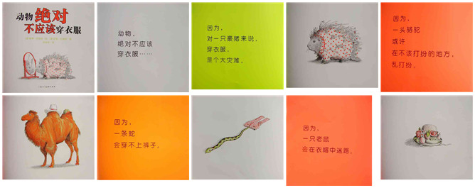 《动物绝对不应该穿衣服》绘本故事PPT。很有想象力和幽默感的一个绘本,可以让孩子认识动物的特征。动物,绝对不应该穿衣服……因为,对一只豪猪来说,穿衣服,是个大灾难。因为,一头骆驼,或许在不该打扮的地方乱打扮。因为,一条蛇,会穿不上裤子。因为,一只老鼠,会在衣帽中迷路。因为,一只绵羊穿上衣服,恐怕会感觉很热。因为,一头猪,可能会把衣服搞得脏兮兮的。因为,母鸡穿上衣服,日子可就不好过了。因为,一只袋鼠,会觉得穿衣服挺没必要的