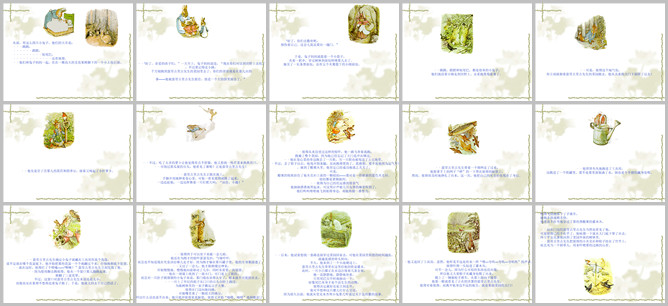 《彼得兔的故事》绘本故事PPT。从前,有四只小兔子,他们名字是:蹬蹬、跳跳、短尾巴,还有彼得。他们和妈妈住在无花果树脚下的小土包后面。一天早上,妈妈说:孩子们,你们可以出去玩了,但是不能去古先生的菜园,你们的爸爸就是在那被捉住的。兔妈妈提着小篮子就去买面包了。蹬蹬、跳跳和短尾巴都很乖,去采浆果了。可是,彼得却立刻向古先生的菜园跑去