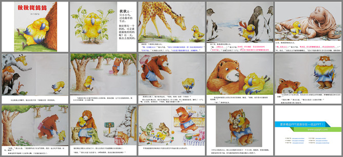 《秋秋找妈妈》绘本故事PPT。秋秋是一只小鸟,自己孤单的生活。他也想像别人一样有个妈妈,有一天,他开始出去找妈妈了。秋秋遇到了长颈鹿太太。秋秋说:你身上的黄色和我一样,你是我妈妈吗?长颈鹿太太说:对不起呀,可我没你那样的翅膀啊。秋秋又找到企鹅太太说:你有和我一样的翅膀,你是我妈妈吗。企鹅太太说:对不起,可我没你那样胖嘟嘟的脸蛋呀!