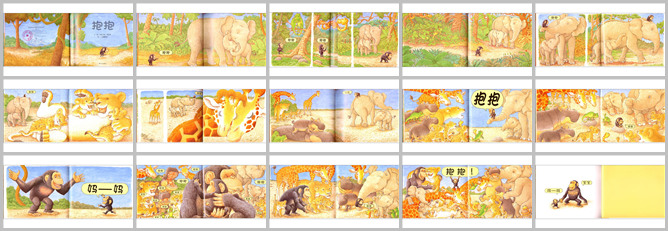 《抱抱》绘本故事PPT。用抱抱传递对孩子的爱,是最直接最温暖的方式。对孩子来说,抱抱永远不嫌多。这是一本近乎屋子的绘本。小猩猩和妈妈走失了,他看到各种相亲相爱的动物,温暖的抱在一起,他好希望有人抱抱他,在好心的大象妈妈的帮助下,小猩猩终于找到了妈妈,最后小猩猩和妈妈抱在一起幸福的神情和眼神非常温情,非常感人