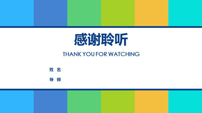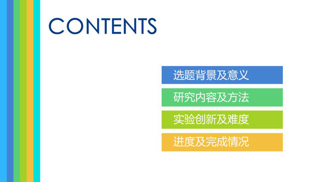 清新活力彩色开题报告PPT模板,采用彩色色条装饰,风格清新简约、时尚活泼。包含选题背景及意义、研究内容及方法、实验创新及难度、进度及完成情况四个部分,共7页,动态播放效果请点击动态预览,涉及字体在压缩包中。