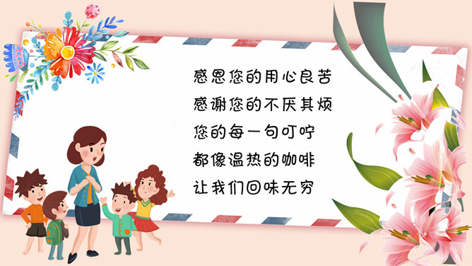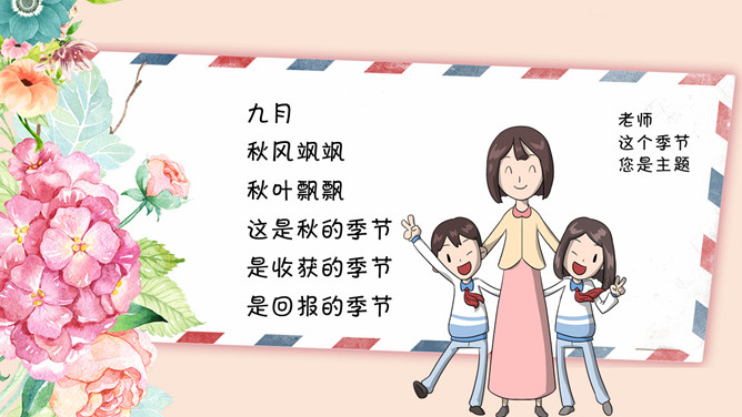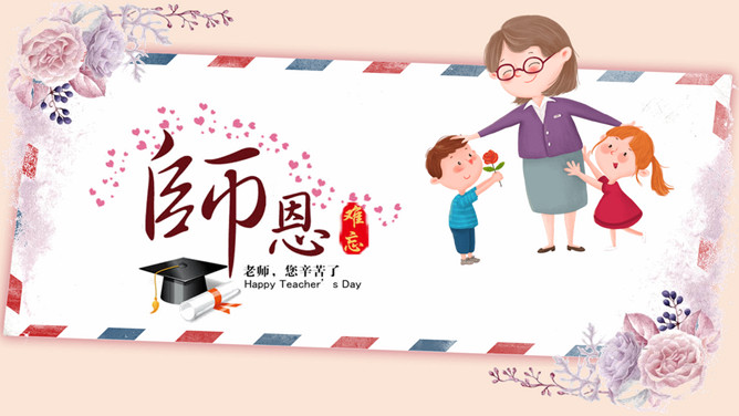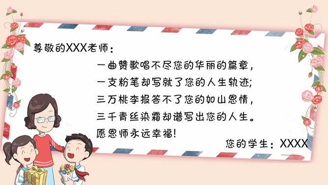 师恩难忘教师节贺卡PPT模板。一曲赞歌唱不尽您的华丽的篇章,一支粉笔却写就了您的人生轨迹;三万桃李报答不了您的如山恩情,三千青丝染霜却谱写出您的人生。愿恩师永远幸福!
