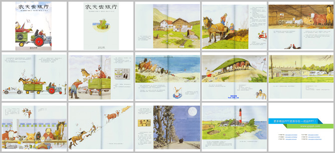 《农夫去旅行》绘本故事PPT。农夫贝克很反对女工托尼去海边度假旅行,不过托尼还是坚决的去了。贝克心想:你去我也去。可是这些动物怎么办呢。贝克想到了一个好办法:把它们都带上!他带着一匹马、两头牛、一只猪、两只羊和四只母鸡出发了。一路上麻烦不断,连住宿都成了大问题,最后农夫贝克在海边找到了一个农场,可是这里和他自己的农场有什么区别呢!