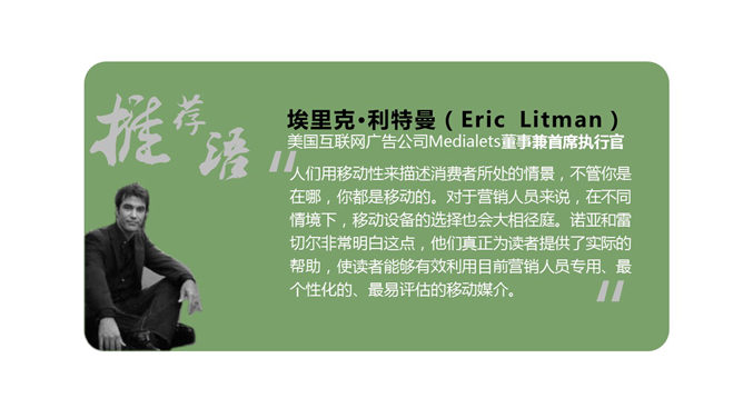 《40天玩转移动营销》PPT读书笔记。这本书囊括了许多关于移动产品应用的战略性指导,清楚明白、设计精心。作者根据丰富的实战经验提供的不是普适的移动营销战略,呈现给读者的是专家的观点,以帮助读者度身定制属于自己的移动战略。