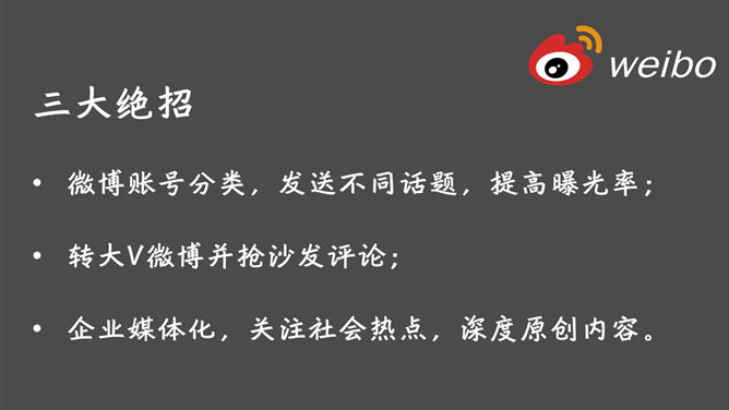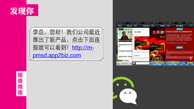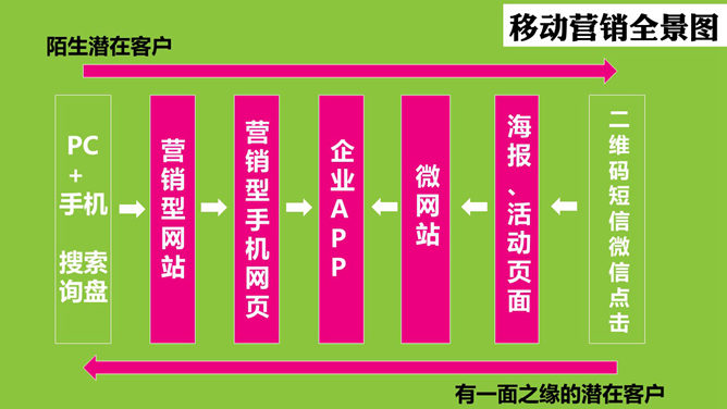微信营销推广知识分享PPT。结合讲座理论和公司现状谈线上推广,未来是移动互联网的时代,每家公司都是移动互联网公司,金钱跟着眼球走,碎片化时间逐渐成为主流时间。使用字体:方正行黑简体、华康俪金黑W8(P)。