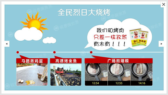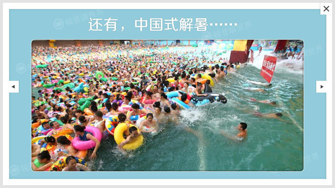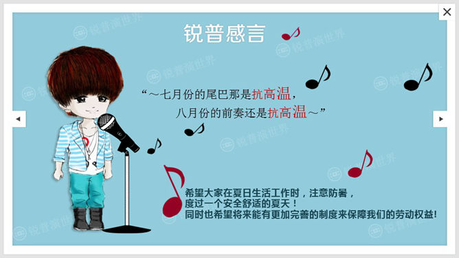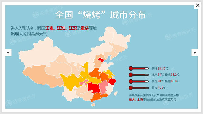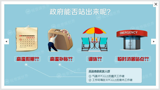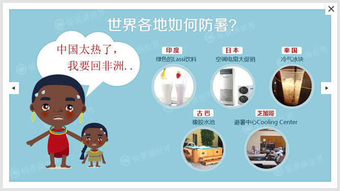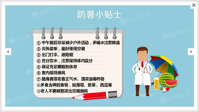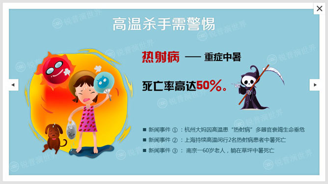 这是一份关于炎热夏天的PPT作品,锐普出品,设计相当精美。介绍全国高温状况、防暑小技巧、其他国家的防暑方法等。使用字体: