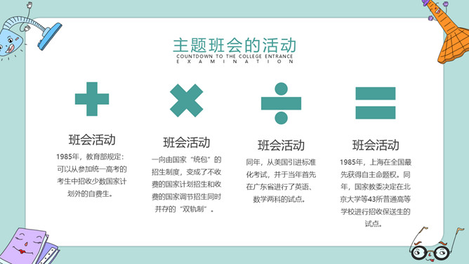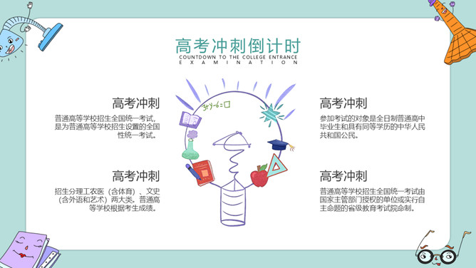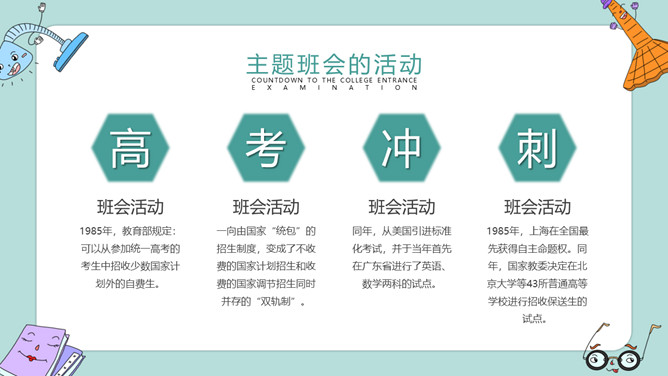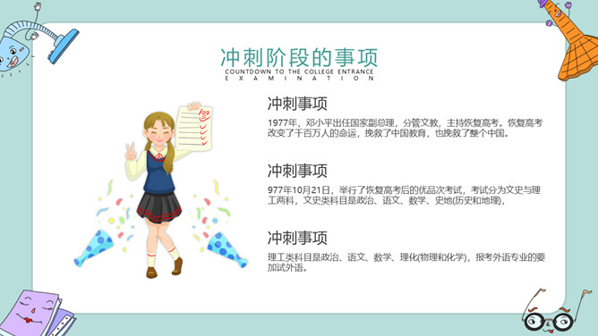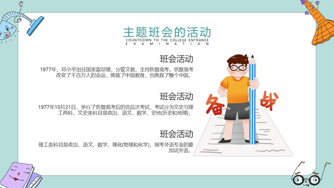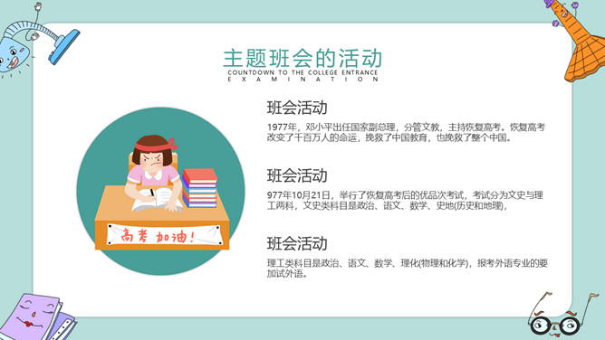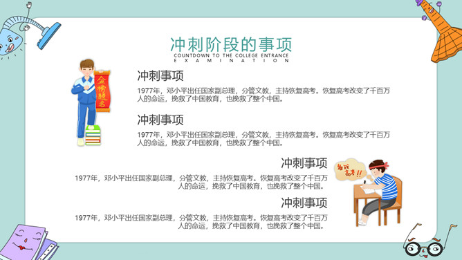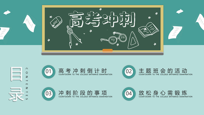 高考加油冲刺主题班会PPT模板。内容包括高考冲刺倒计时、主题班会的活动、冲刺阶段的事项、放松身心需锻炼。