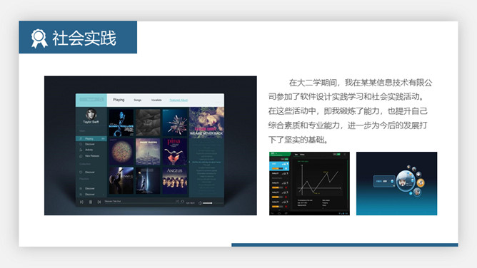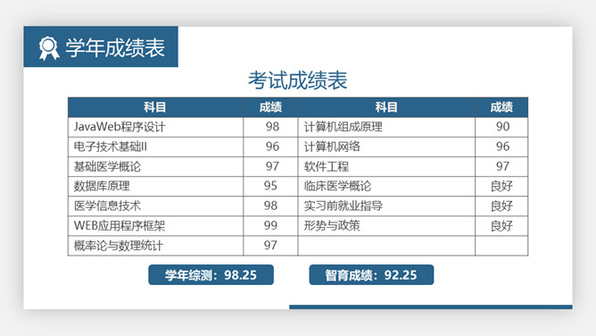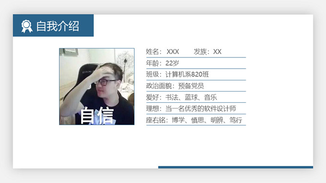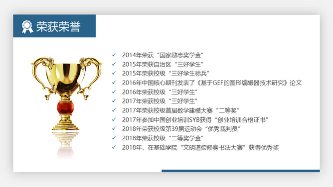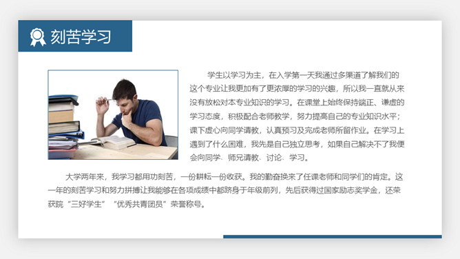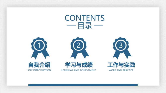 大学生奖学金申请答辩PPT模板。极简设计风格,悬浮卡片效果设计,大气稳重蓝色主色调,动态播放效果。