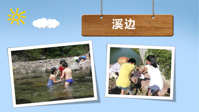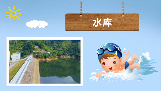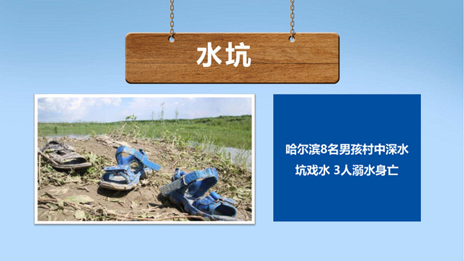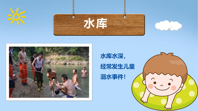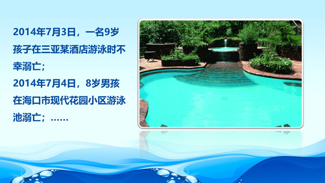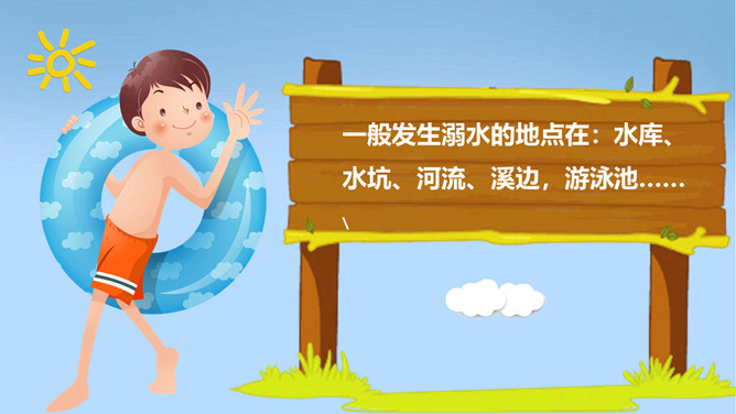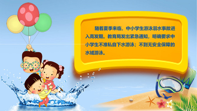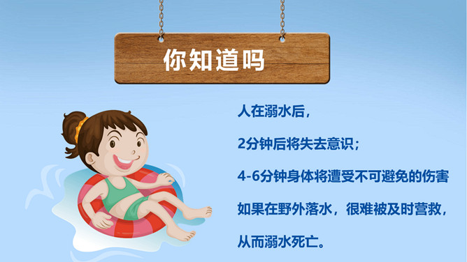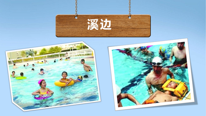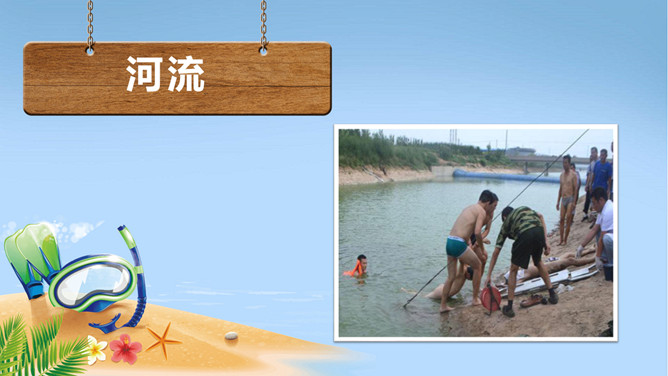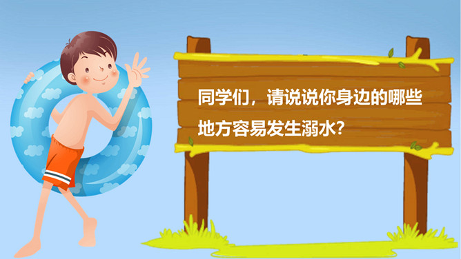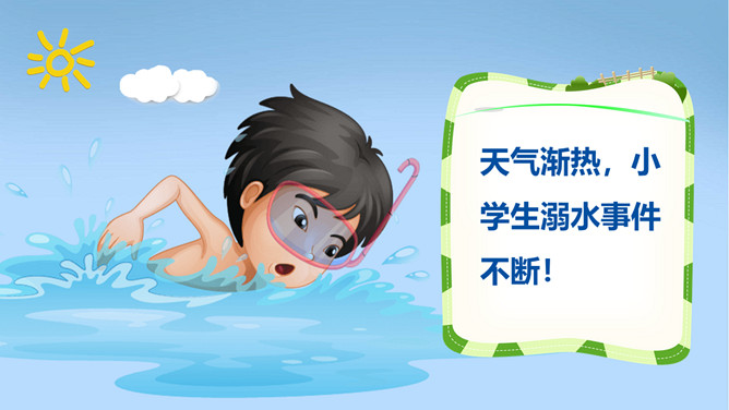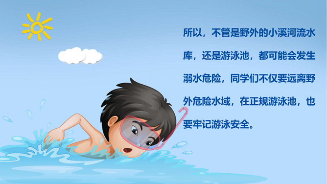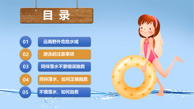 小学生防溺水教育班会PPT模板。内容包括远离野外危险水域、游泳的注意事项、同伴落水不要错误施救、同伴落水如何正确施救、不慎落水如何自救。