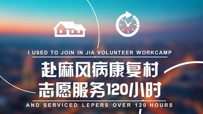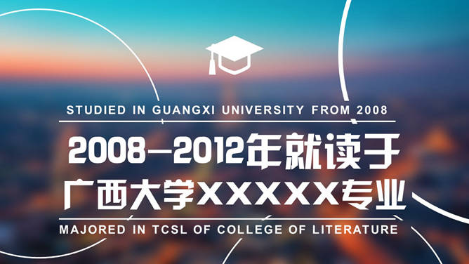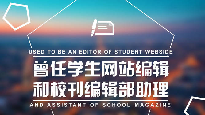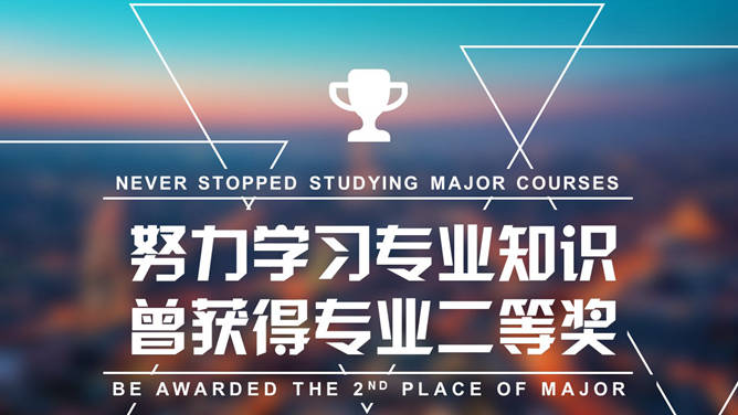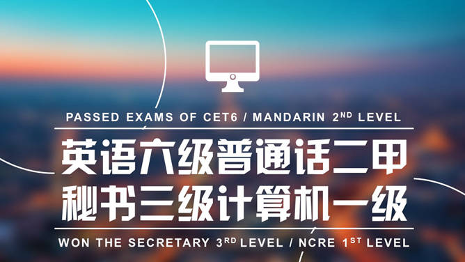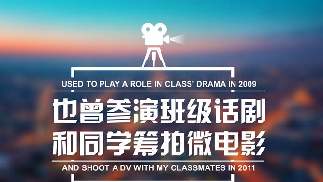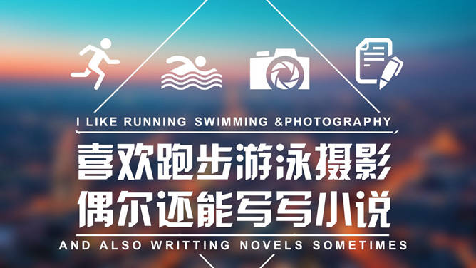 一份有创意的大学生求职个人简历PPT模板,时尚全图背景配合大号字体,共32页,内容非常详尽,好看的动态效果。使用字体: