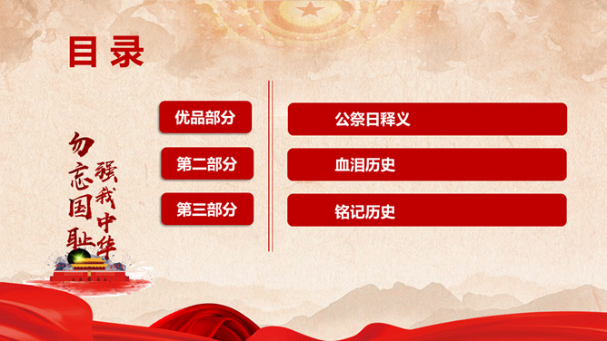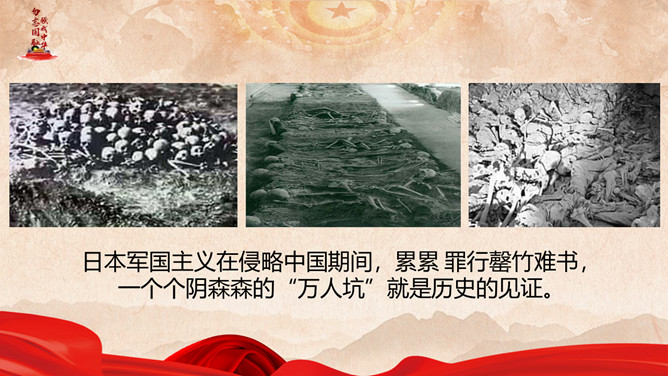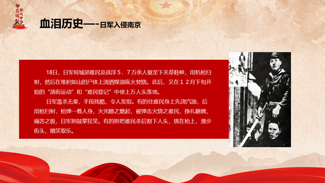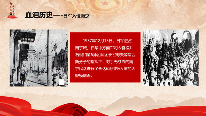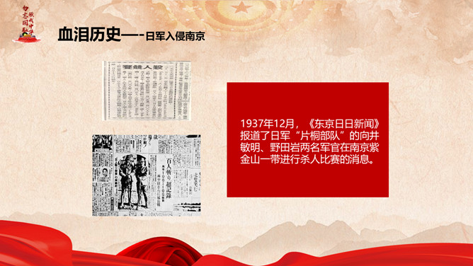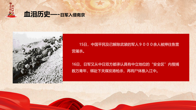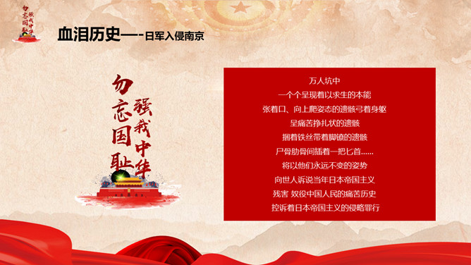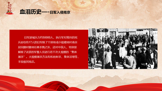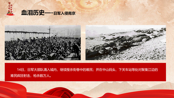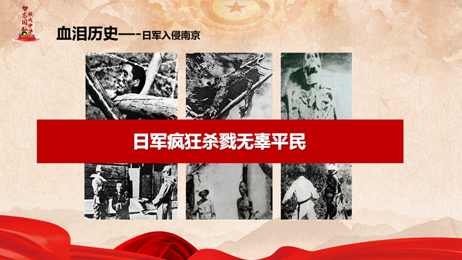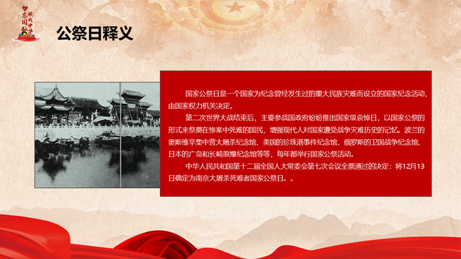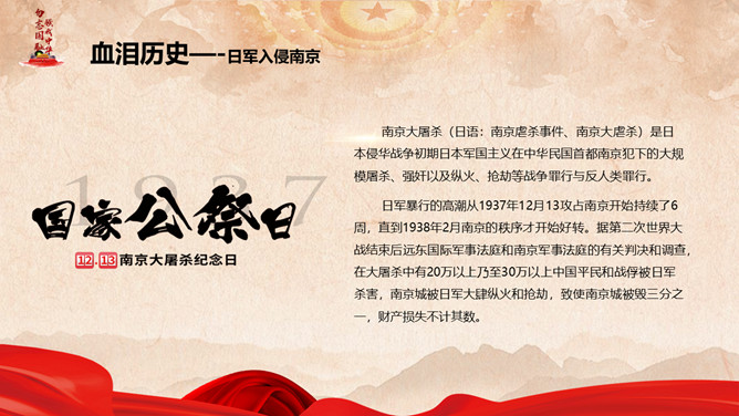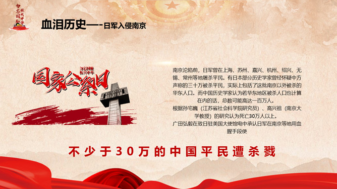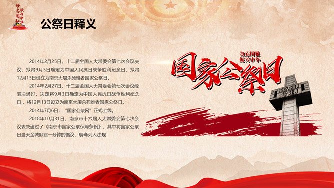 南京大屠杀国家公祭日PPT模板。2014年2月25日,十二届全国人大常委会第七次会议决议,拟将9月3日确定为中国人民抗日战争胜利纪念日,拟将12月13日设立为南京大屠杀死难者国家公祭日。