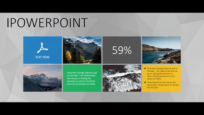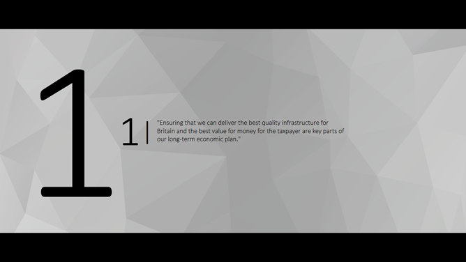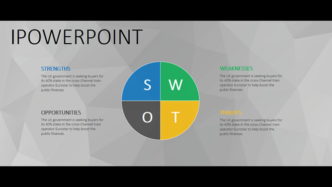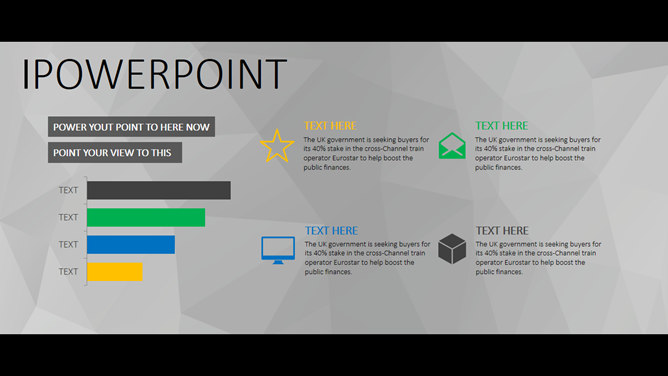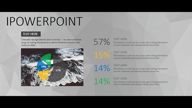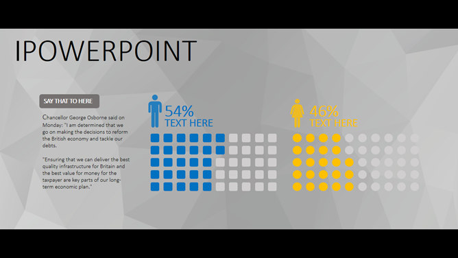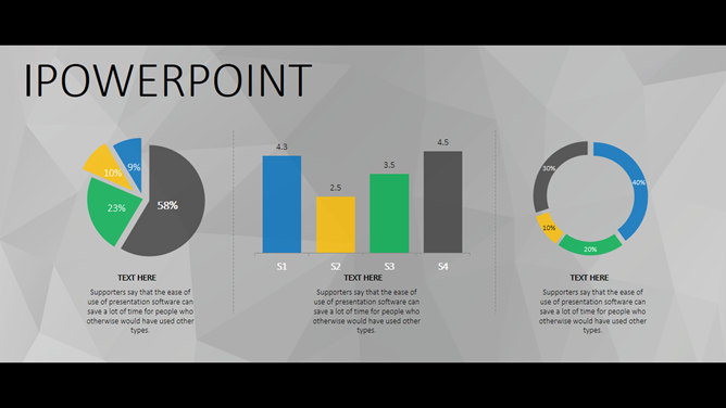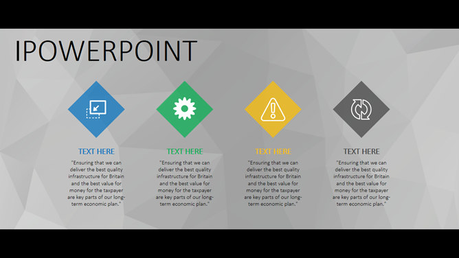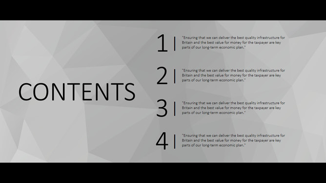 一份大气稳重的商务风格幻灯片模板,灰色多边形背景,黑边超宽屏设计,简约稳重,彩色元素点缀又显得有活力不沉闷,共19页,包含了各类基本页面类型,更多同类模板请点击: