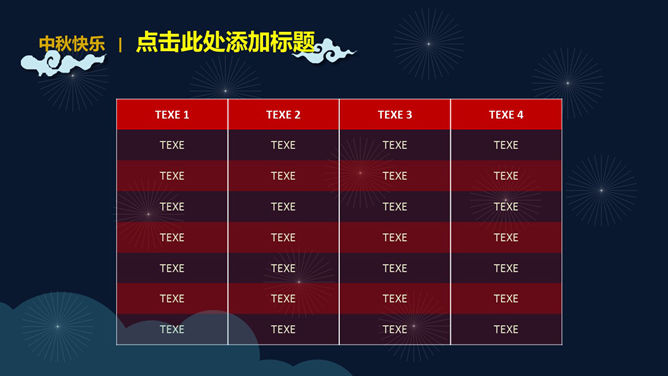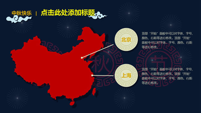 ,以祥云、玉兔、印章、灯笼月饼形状的月亮等矢量元素设计,代表夜空的深蓝色底色,动态播放效果,共11页,适合中秋节相关主题使用。本本模板来源于OfficePLUS。
