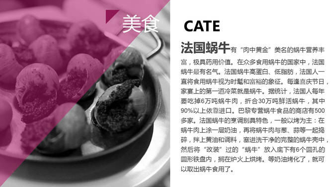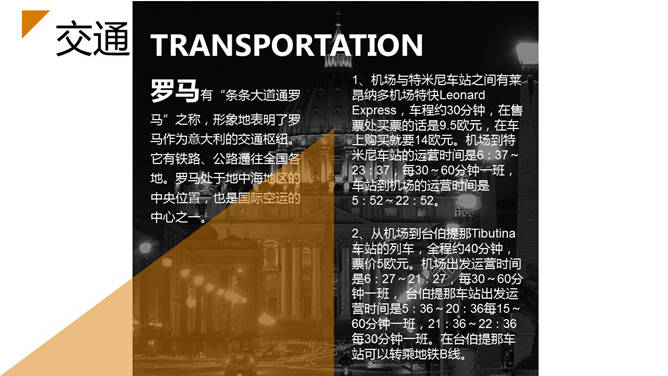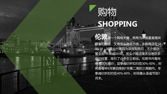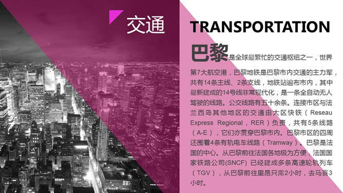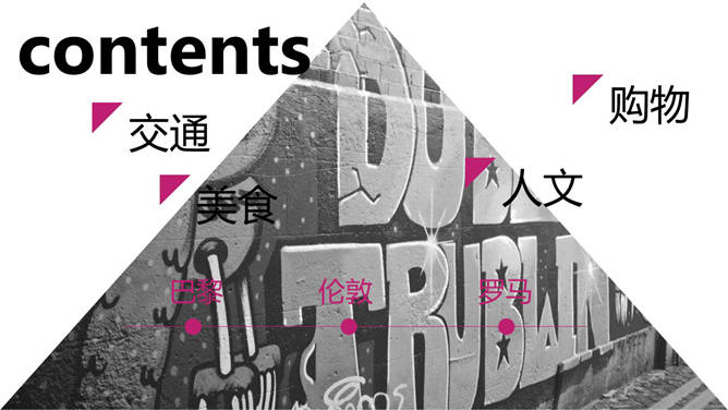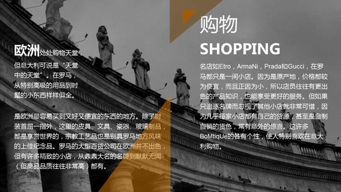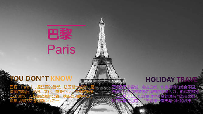 欧洲旅行城市介绍PPT模板,好看的杂志设计风格,介绍了巴黎、伦敦及罗马三个城市的交通、美食、人文、购物等方面。
