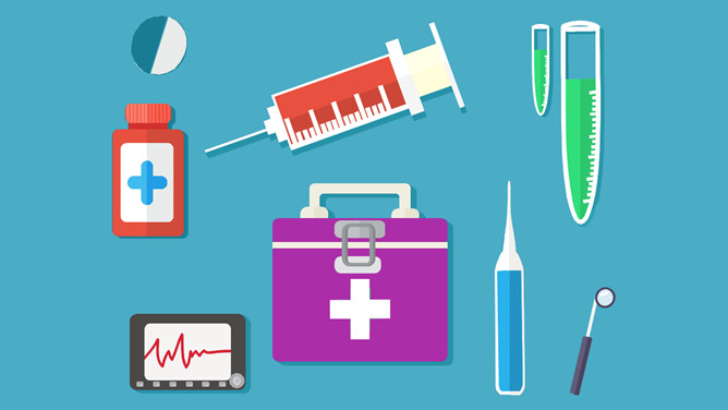 矢量医疗器械器材PPT素材,大小颜色形状完全可编辑,注射器 药品药瓶 体温计 医疗箱 血压仪 药片。