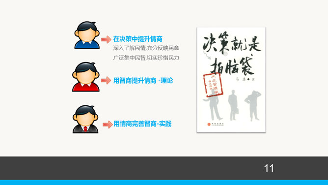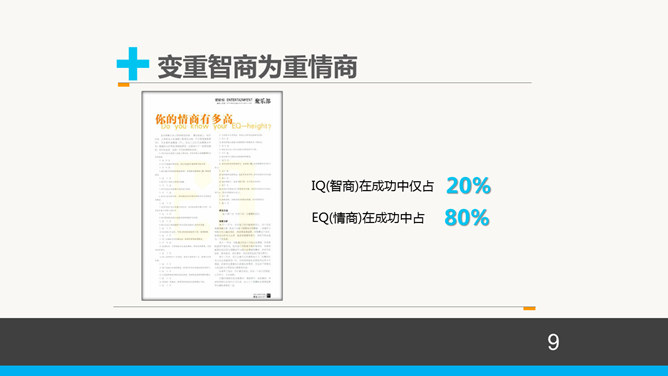 情商管理培训PPT课件下载。EQ,是一种自我情绪控制能力的指数,由美国心理学家彼德·萨洛维于1991年创立,属于发展心理学范畴。它主要是指人在情绪、情感、意志、耐受挫折等方面的品质。丹尼尔·高尔曼(Daniel Goleman)和其他几个研究者,揭露了情绪商数的概念并声称它至少像更传统的“智力”一样重要。跟IQ不一样,情绪智商可经人指导而改善。