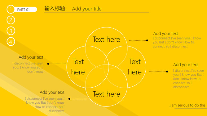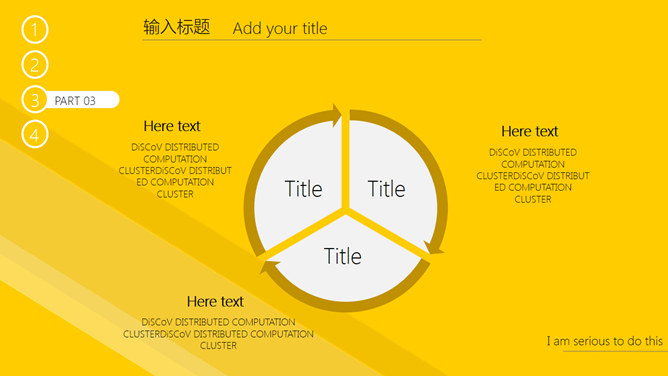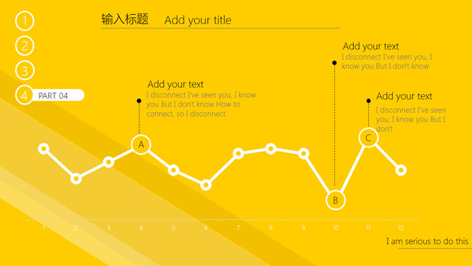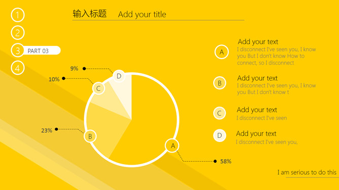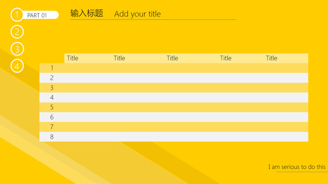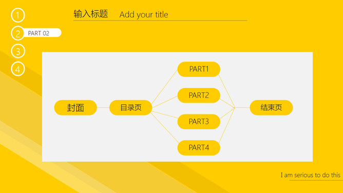 一份极简风格的幻灯片模板,带斜条亮黄色背景,简约醒目,共十页,包括目录页、表格、饼图、折线图、图文等页面。