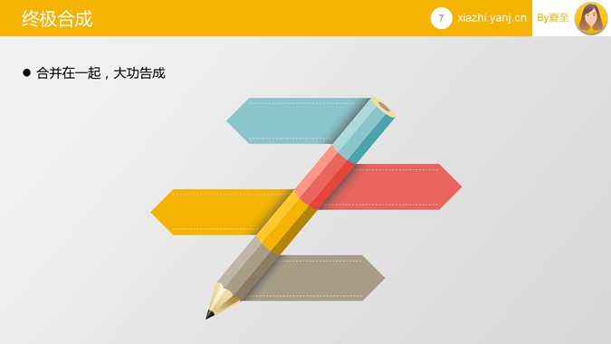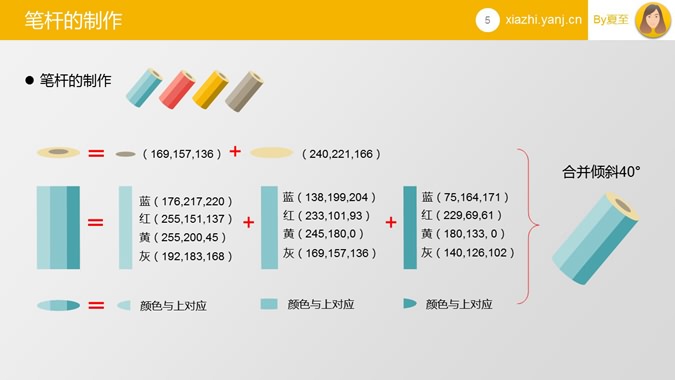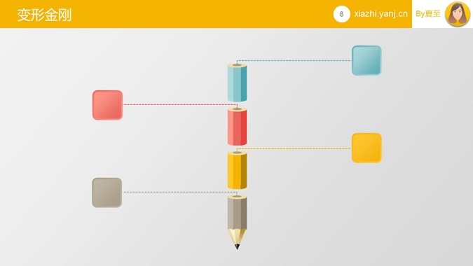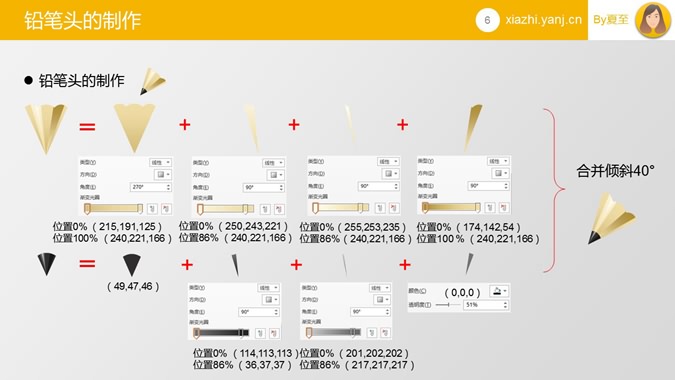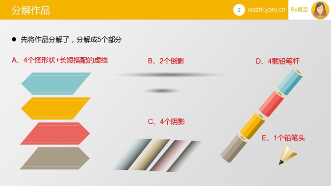 先把作品分解了,分解成5个部分。然后制作怪形状、倒影、阴影、笔杆、铅笔头,最后合并在一起,大功告成了。