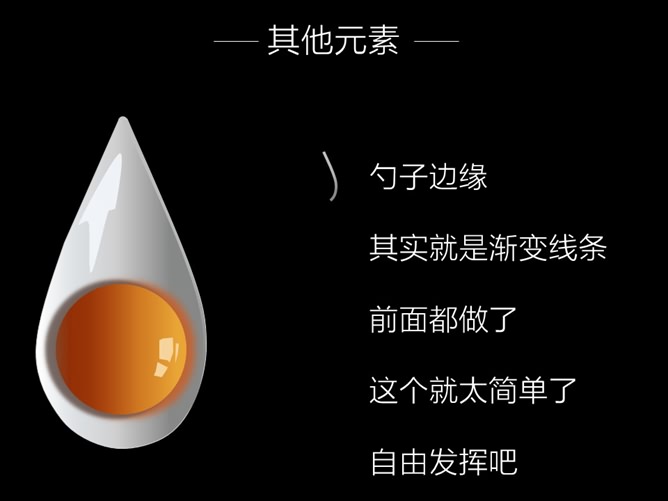 “撸蛋”之后,有一大波朋友们私信问,如何用PPT画,于是就有了这份教程。首先拆分成几个部件:勺子、勺子边缘、勺子高光元素、带阴影的渐变蛋黄、渐变蛋黄高光元素、渐变蛋黄底部柔光。接下来就是各个部件的制作,其实就是绘制部件然后渐变设置而已,最后组合。掌握渐变技能制作立体效果图表就很轻松了。