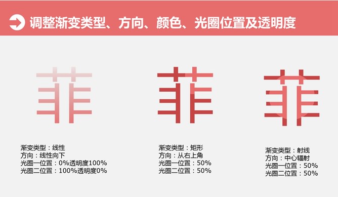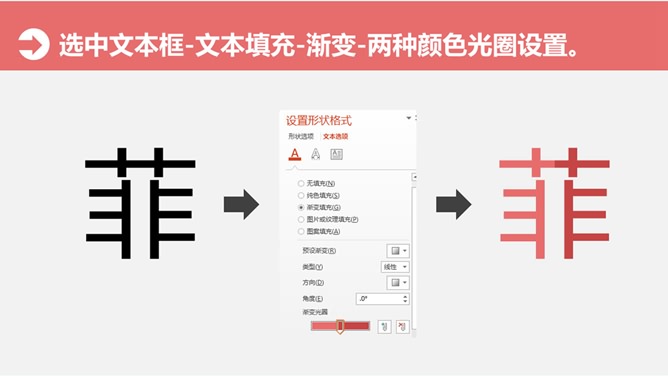 文字颜色渐变设置PPT教程。大猫菲菲6号教程:文字渐变填充-双色。步骤:1、选中文本框-文本填充-渐变-两种颜色光圈设置。2、调整渐变类型、方向、颜色、光圈位置及透明度。3、调整渐变类型、方向、颜色、光圈位置及透明度。