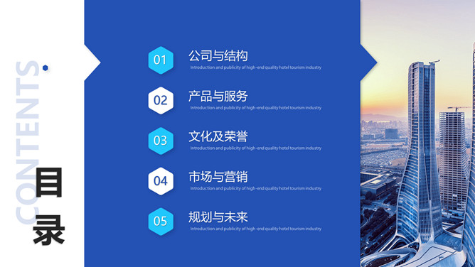 简约大气公司介绍宣传PPT模板。包括公司与结构、产品与服务、文化及荣誉、市场与营销、规划与未来等内容。