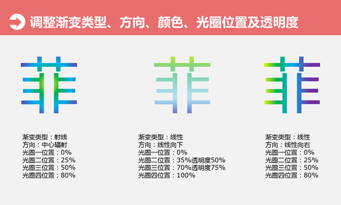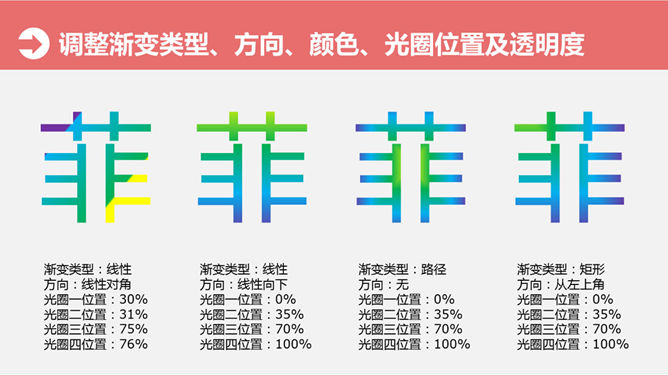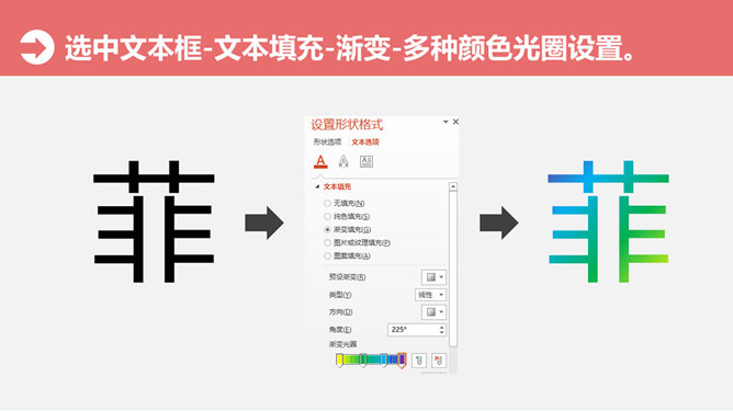 文字彩色渐变填充PPT教程。大猫菲菲7号教程:文字渐变填充-多色。步骤:1、选中文本框-文本填充-渐变-多种颜色光圈设置。2、调整渐变类型、方向、颜色、光圈位置及透明度。