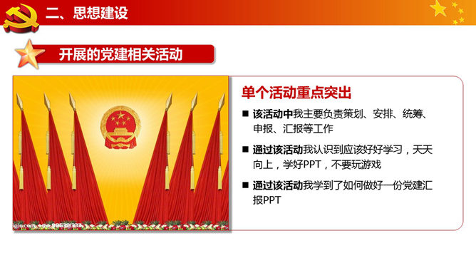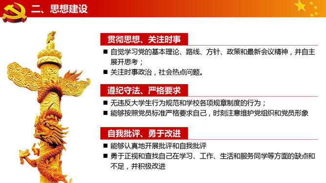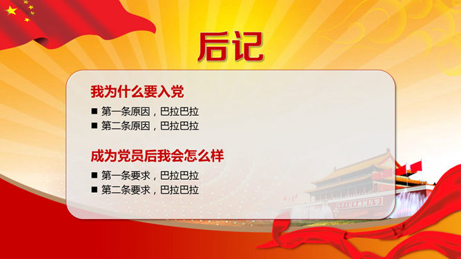 大学生入党答辩PPT模板下载。采用国旗、天安门、党徽、国徽、华表等党政类元素设计,精美庄重大气,漂亮的动态切换效果,也可用于政府公务人员工作汇报或党支部党建工作汇报报告等用途。