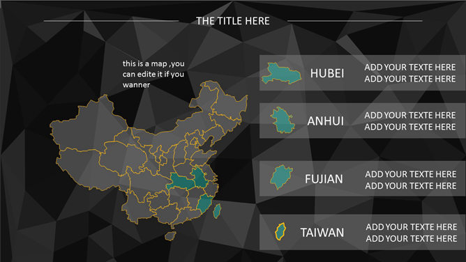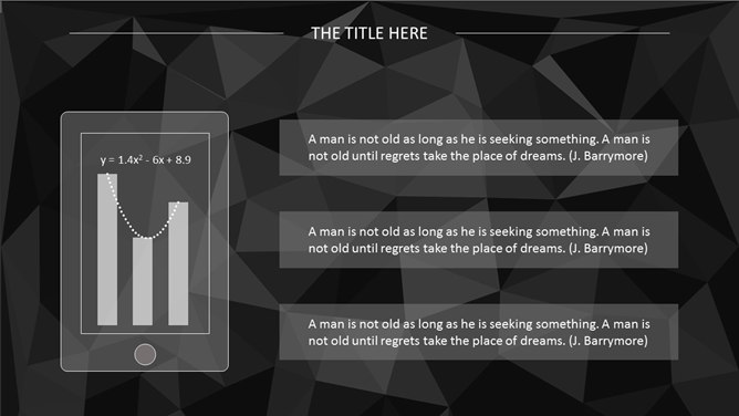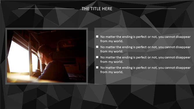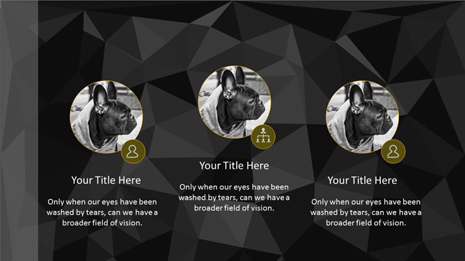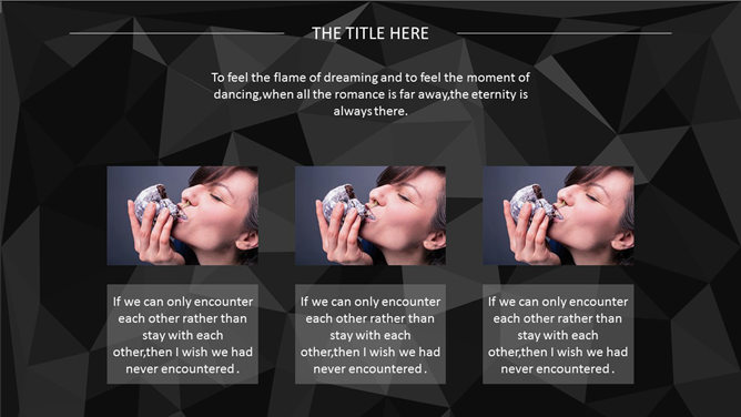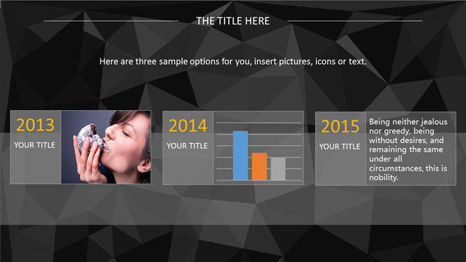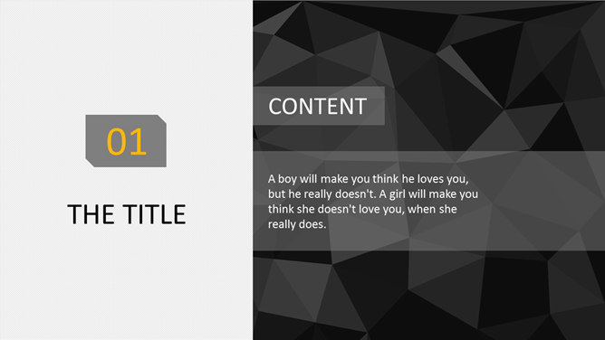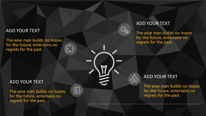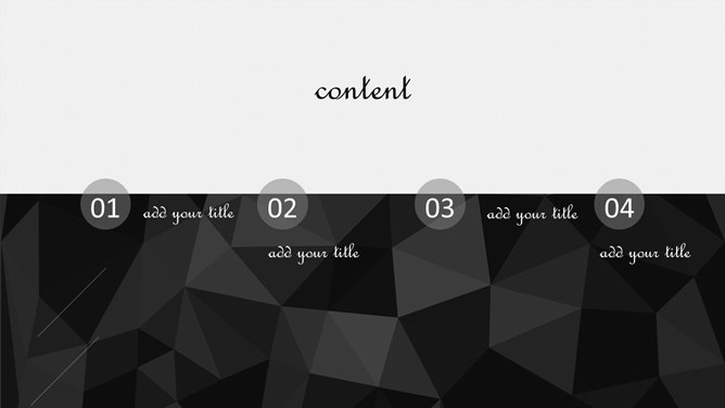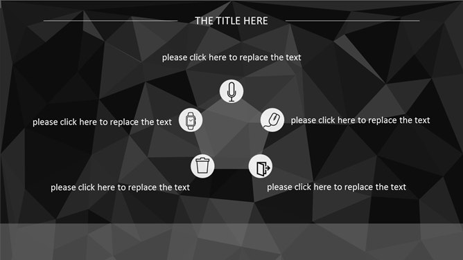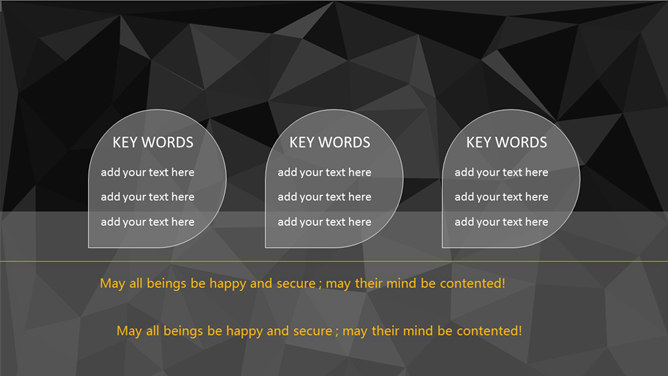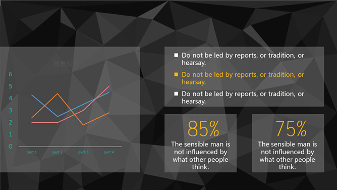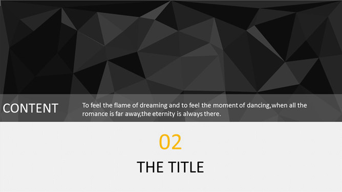 一份多功能通用幻灯片模板,黑色Low Poly低多边形背景,半透明元素及文本框,页面类型丰富,可使用场合广泛。