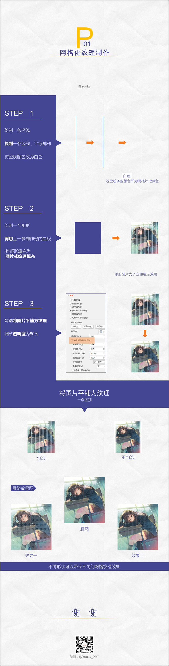 图片网格化纹理制作PPT教程。步骤:1、绘制一条竖线,复制一条竖线,平行排列,将竖线颜色改成白色。2、绘制一个矩形,剪切上一步做好的白线,将矩形填充为图片或纹理填充。3、勾选将图片平铺为纹理,调节透明度为80%。打完收工。作者:@Youka_PPT。