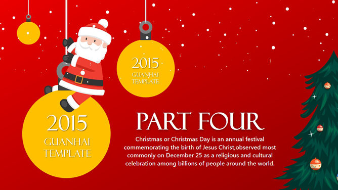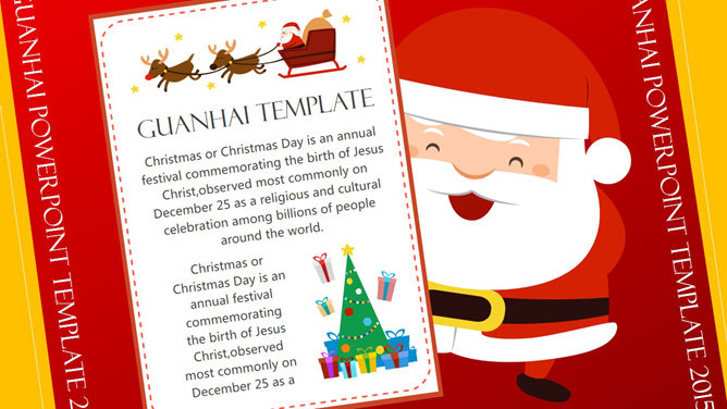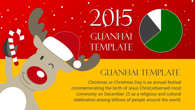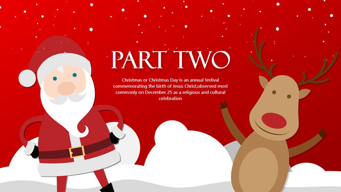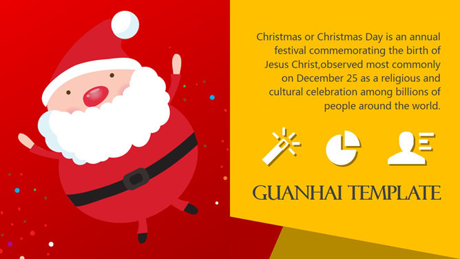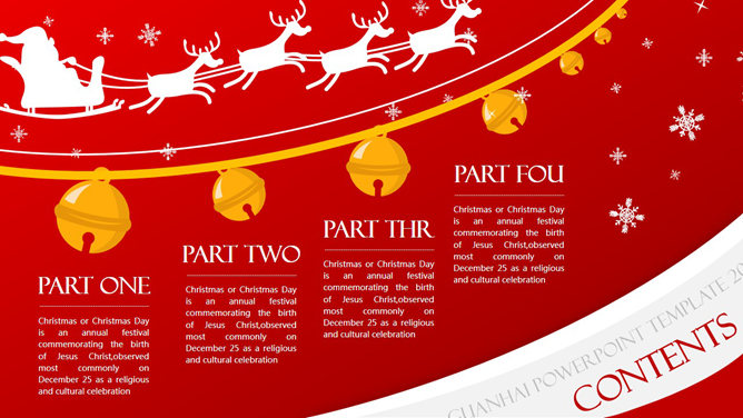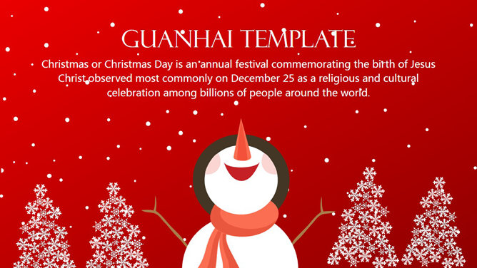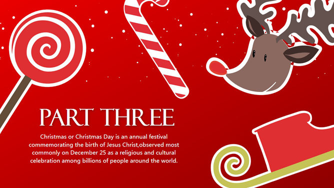 一份非常精美的圣诞节PPT模板,喜庆红色主色调,采用雪人、圣诞老人、圣诞树、驯鹿等圣诞节元素设计,喜庆欢乐的视觉传达,扁平化设计风格,堪比收费模板。建议安装字体: