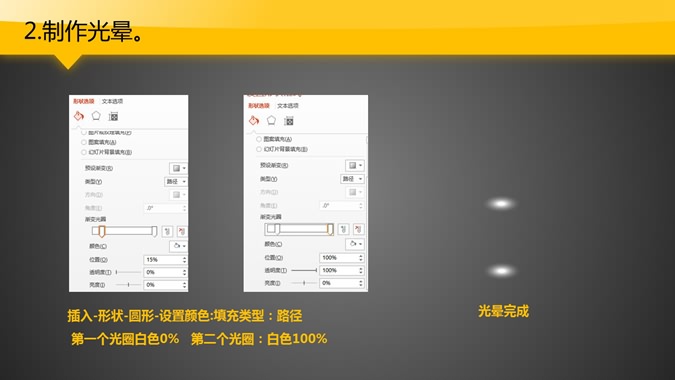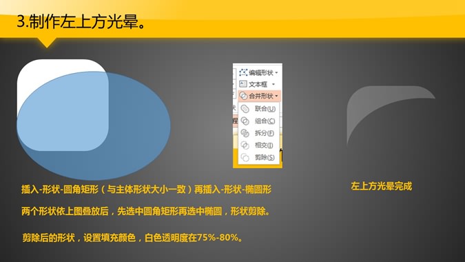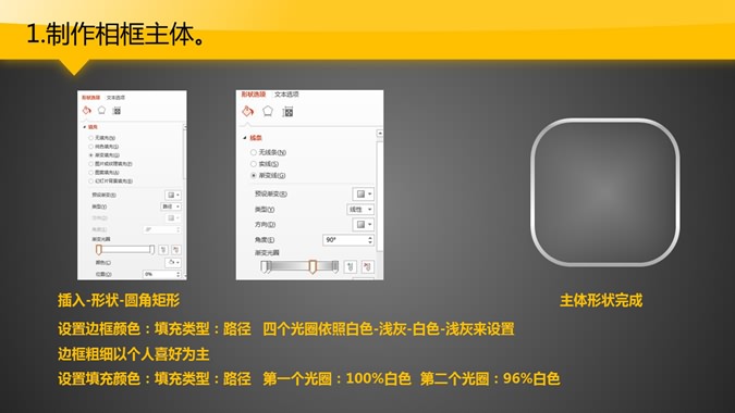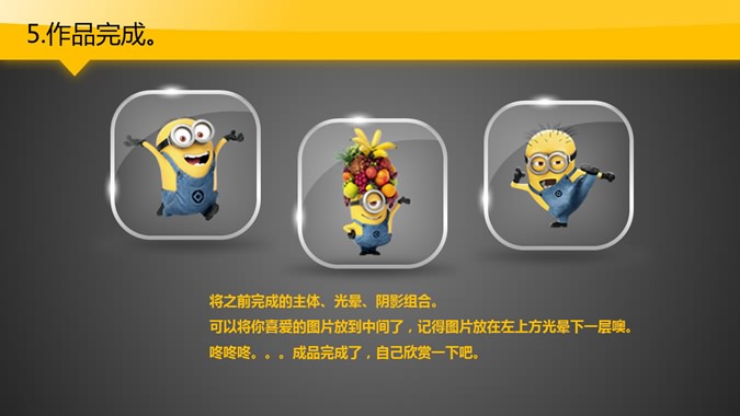 五步制作立体水晶质感相框PPT教程:1.制作相框主体。2.制作光晕。3.制作左上方光晕。4.制作右下方阴影。5.作品完成。
