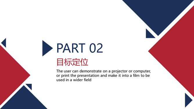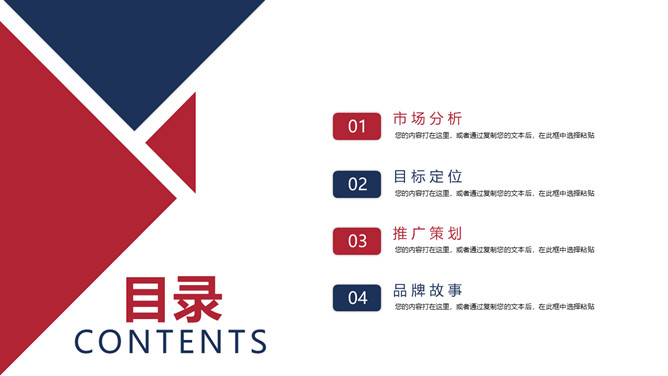红蓝三角品牌推广方案策划PPT模板。一套品牌策划推广方案模板,时尚红蓝英伦风设计,三角形元素背景。