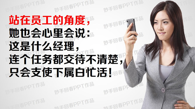 心中有结果,执行有效果——这是一份来自妙手回春的关于上下级的沟通的方法的PPT作品,采用了场景化的人物对白设计,非常直观,富有表现力,适合用于人力资源培训使用。