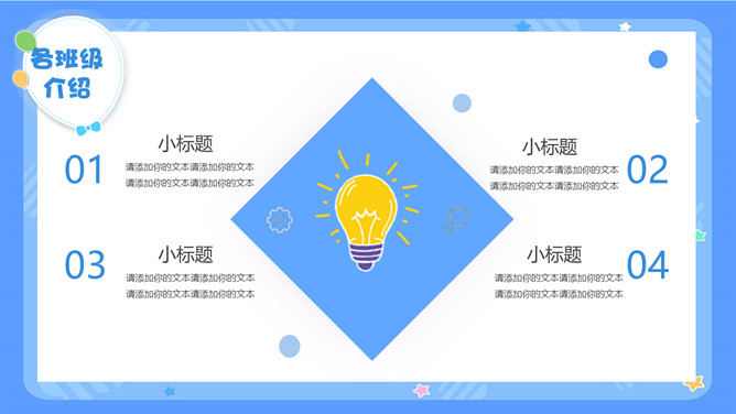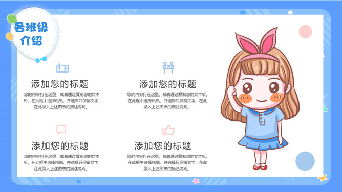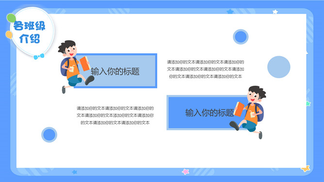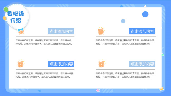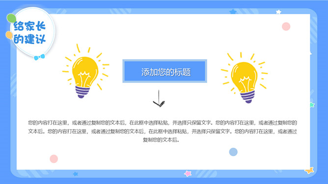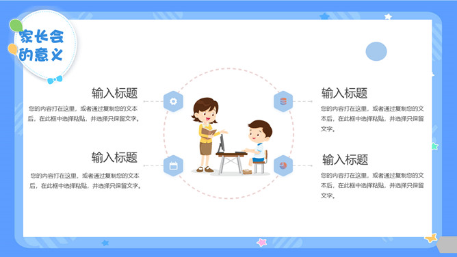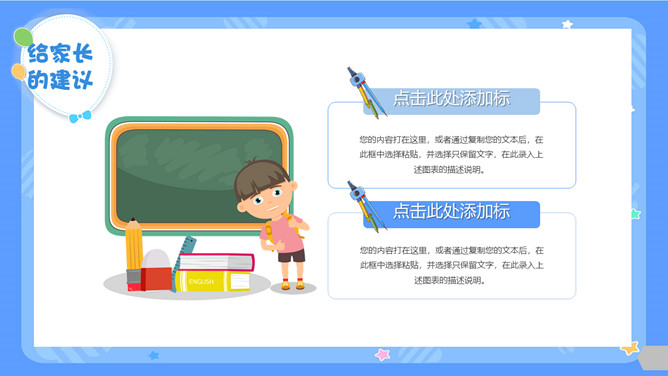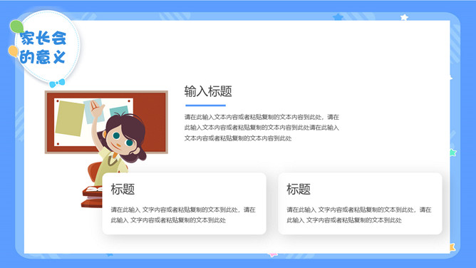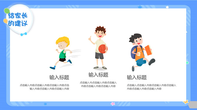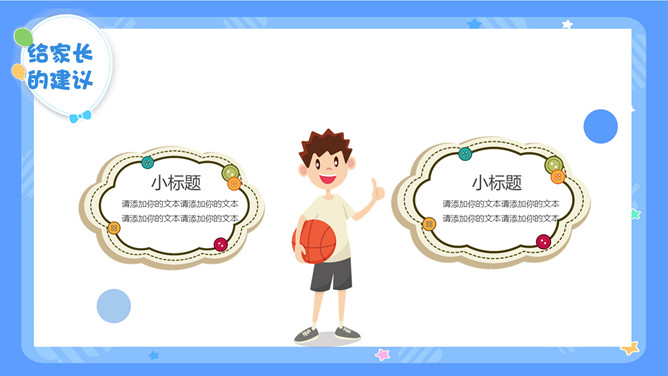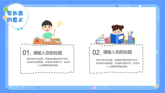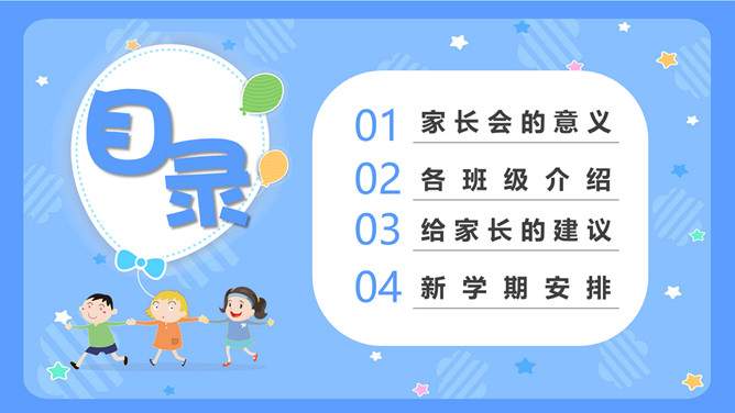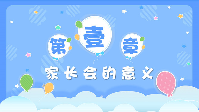 儿童幼儿园小学家长会PPT模板。一套幼儿园小学家长会通用模板,可爱小朋友、气球、云朵背景,蓝色主色调。
